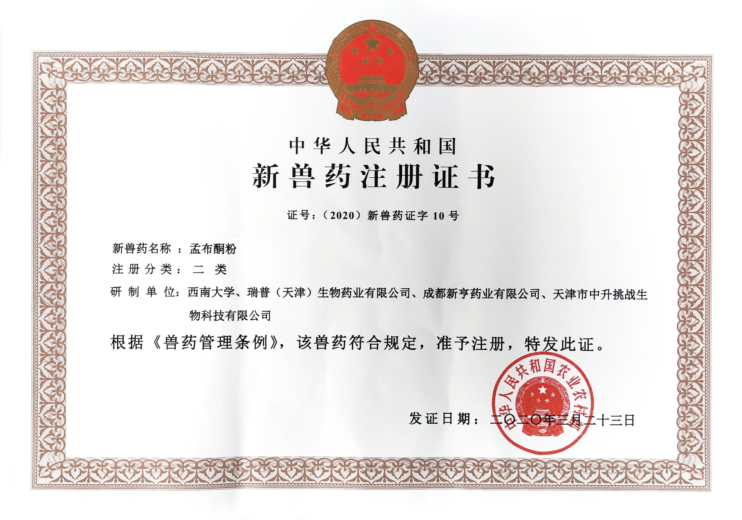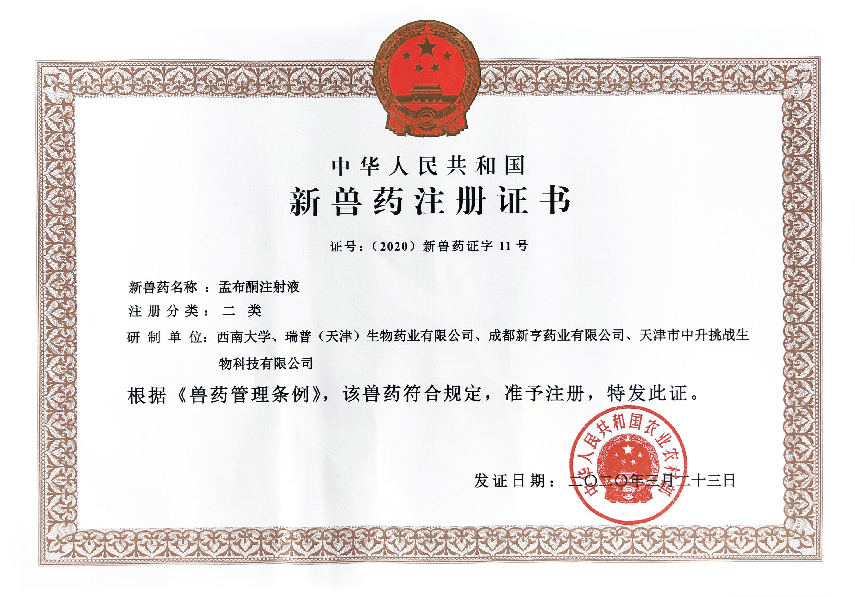 新兽药证书